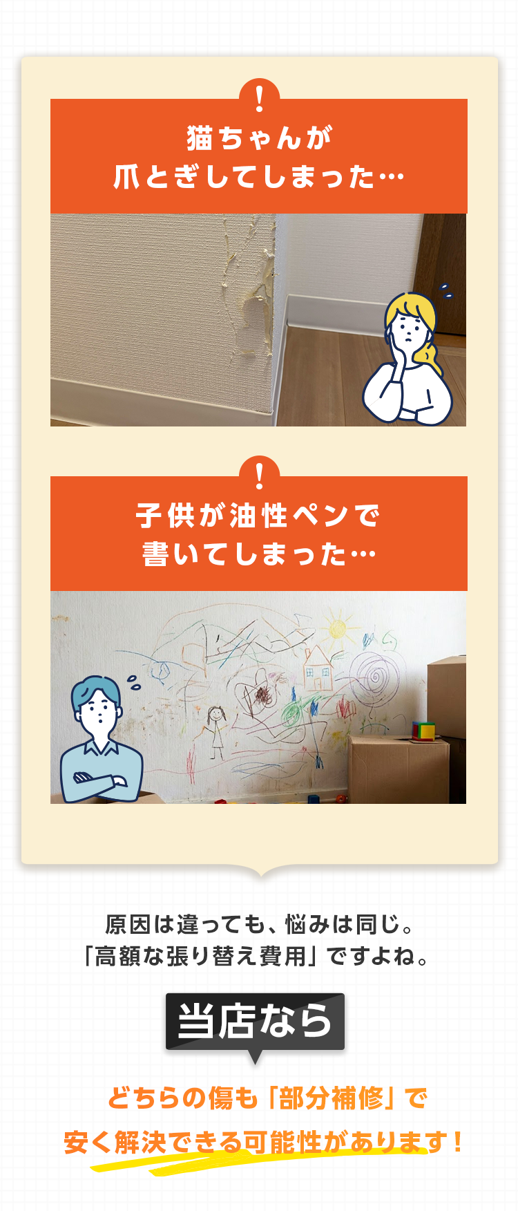 当店の価格はリーズナブルですが、仕事の質は一切妥協しません。「余計なコストを省いた本物のプロの仕事」をご提供します。本職の職人たちが 壁紙一枚一枚に魂を込めて補修しますので、どうぞ安心してお任せください。